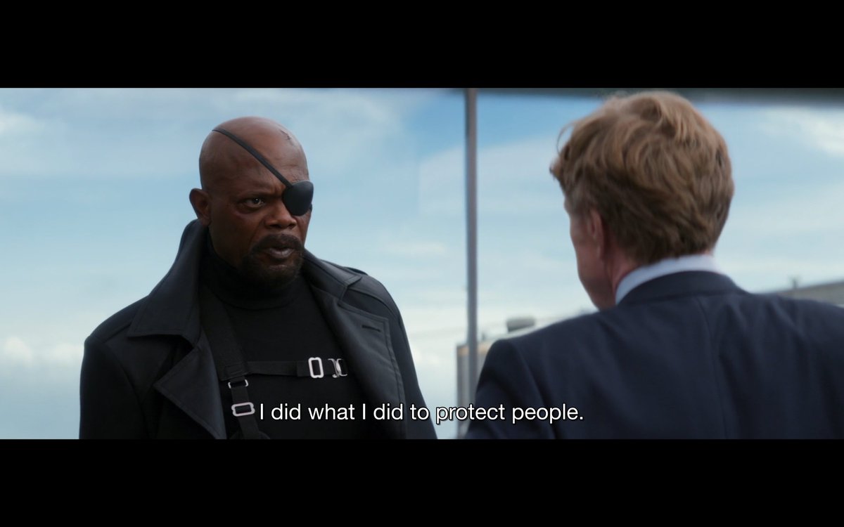 I feel like Fury gets off way too easy in this movie, he basically admits to a career of committing atrocities for SHIELD/HYDRA, but it’s okay because he did it to “protect people?” Sounds a lot like the same BS excuse the CIA gives.
